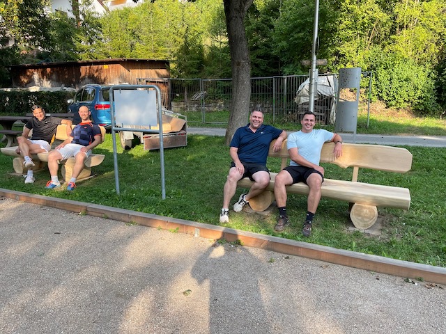 Beim Aufstellen der Bänke erhielten wir ganz selbstverständlich Unterstützung von Spielern des Tennisvereins - und so konnte auch unser Bürgermeister Andreas Vierling die neuen Bänke „seines“ Vereins gleich probesitzen.