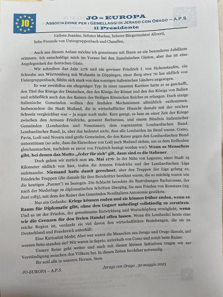 Lieber Mauro, liebe Jeanine, liebe Freunde hier aus Jerago und aus Chazelles, liebe Mitgereiste aus Untergruppenbach, verehrte Gäste,