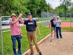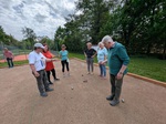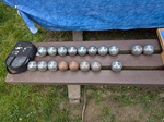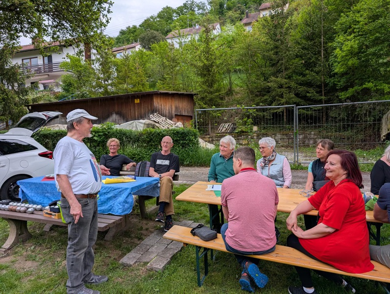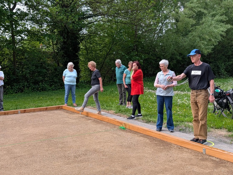 Zunächst erklärte Karlheinz den Teilnehmer*innen kurz die Geschichte und die Grundregeln des Spiels, das wir ja alle mit Frankreich verbinden. Zum Glück war auch Petrus gnädig; der Regen hörte während der Vorbereitungen auf und setzte erst am Abend wieder ein. So entwickelten sich interessante Matches, und auch die Anfänger*innen sahen schnell, dass der Umgang mit den um 700g schweren Kugeln kein Hexenwerk ist. So gelang schließlich auch der eine oder andere „tir“, also das Wegschießen besser platzierter gegnerischer Kugeln mit einem gezielten Wurf über 6-12 Meter!